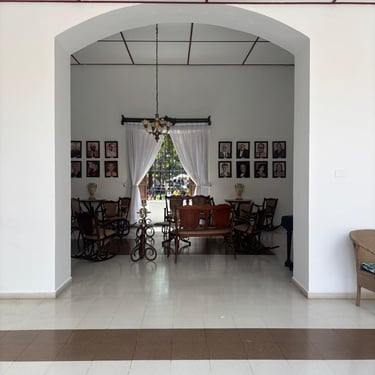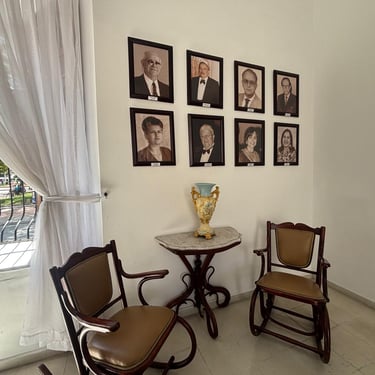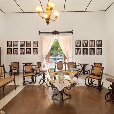 Ambiente refinado con muebles victorianos tallados, candelabro clásico, galería de retratos familiares notables y luz natural a través de ventanas con rejas ornamentales. Un rincón vivo de tradición y memoria.