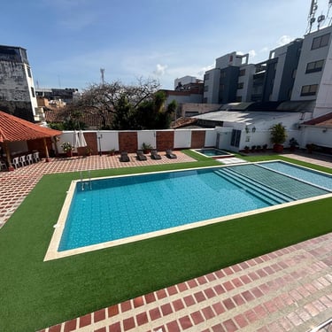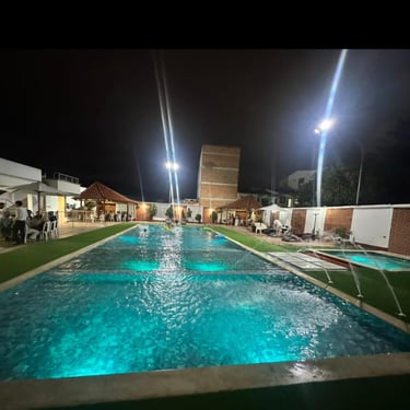 en nuestra piscina amplia y refrescante, con agua siempre impecable y zona de descanso ideal. Complementada con jacuzzi (puro relax con burbujas) y dos piscinas pensado para los niños y Adultos.